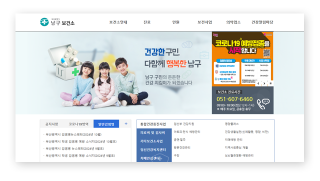 부산남구보건소의 다양한 정보와 서비스를 온라인에서 확인할 수 있습니다. 예방접종, 건강검진, 각종 보건사업 등에 대한 자세한 내용을 확인하고 신청할 수 있습니다.