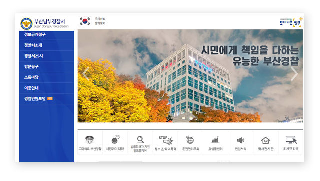 부산남부경찰서 홈페이지에서는 다양한 경찰 서비스와 관련된 정보를 제공하고 있습니다. 홈페이지를 통해 민원 접수, 범죄 신고, 경찰서 관련 최신 소식 등을 확인하실 수 있습니다. 필요한 서류를 미리 준비하시거나 상담 예약을 하고자 하시는 분들께 유용한 자료를 제공하고 있으니 적극 활용하시기 바랍니다.