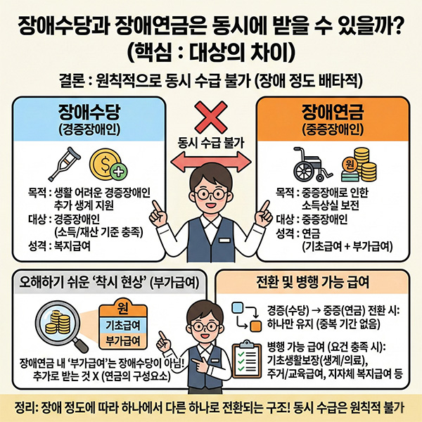 - 장애수당 + 장애연금 → 동시 수급 불가