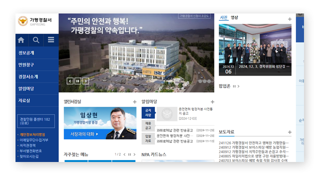 가평경찰서 홈페이지에서는 다양한 경찰 서비스와 관련된 정보를 제공하고 있습니다. 홈페이지를 통해 민원 접수, 범죄 신고, 경찰서 관련 최신 소식 등을 확인하실 수 있습니다. 필요한 서류를 미리 준비하시거나 상담 예약을 하고자 하시는 분들께 유용한 자료를 제공하고 있으니 적극 활용하시기 바랍니다.