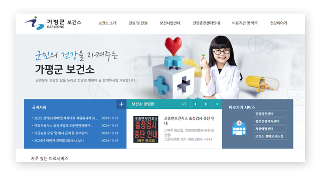 가평군보건소의 다양한 정보와 서비스를 온라인에서 확인할 수 있습니다. 예방접종, 건강검진, 각종 보건사업 등에 대한 자세한 내용을 확인하고 신청할 수 있습니다.