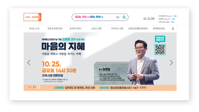 군포시보건소의 다양한 정보와 서비스를 온라인에서 확인할 수 있습니다. 예방접종, 건강검진, 각종 보건사업 등에 대한 자세한 내용을 확인하고 신청할 수 있습니다.