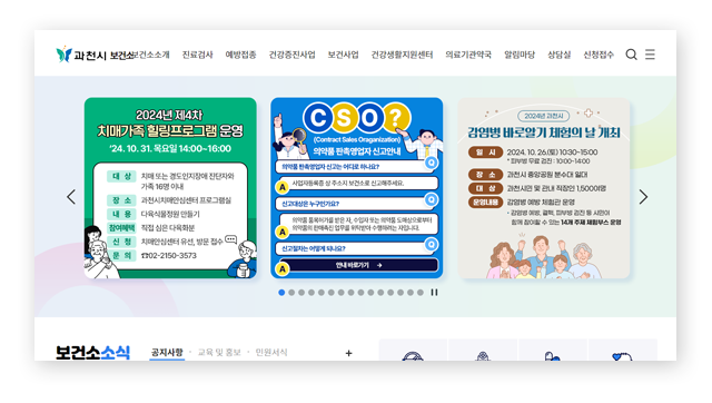 과천시보건소의 다양한 정보와 서비스를 온라인에서 확인할 수 있습니다. 예방접종, 건강검진, 각종 보건사업 등에 대한 자세한 내용을 확인하고 신청할 수 있습니다.