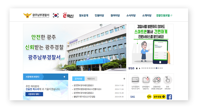 광주남부경찰서 홈페이지에서는 다양한 경찰 서비스와 관련된 정보를 제공하고 있습니다. 홈페이지를 통해 민원 접수, 범죄 신고, 경찰서 관련 최신 소식 등을 확인하실 수 있습니다. 필요한 서류를 미리 준비하시거나 상담 예약을 하고자 하시는 분들께 유용한 자료를 제공하고 있으니 적극 활용하시기 바랍니다.