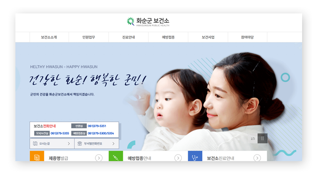 화순군보건소의 다양한 정보와 서비스를 온라인에서 확인할 수 있습니다. 예방접종, 건강검진, 각종 보건사업 등에 대한 자세한 내용을 확인하고 신청할 수 있습니다.