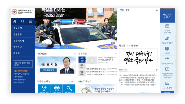 남양주북부경찰서 홈페이지에서는 다양한 경찰 서비스와 관련된 정보를 제공하고 있습니다. 홈페이지를 통해 민원 접수, 범죄 신고, 경찰서 관련 최신 소식 등을 확인하실 수 있습니다. 필요한 서류를 미리 준비하시거나 상담 예약을 하고자 하시는 분들께 유용한 자료를 제공하고 있으니 적극 활용하시기 바랍니다.
