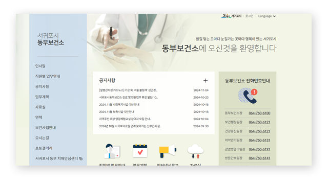 서귀포시동부보건소의 다양한 정보와 서비스를 온라인에서 확인할 수 있습니다. 예방접종, 건강검진, 각종 보건사업 등에 대한 자세한 내용을 확인하고 신청할 수 있습니다.