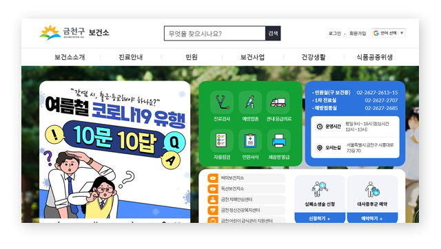 금천구보건소의 다양한 정보와 서비스를 온라인에서 확인할 수 있습니다. 예방접종, 건강검진, 각종 보건사업 등에 대한 자세한 내용을 확인하고 신청할 수 있습니다.