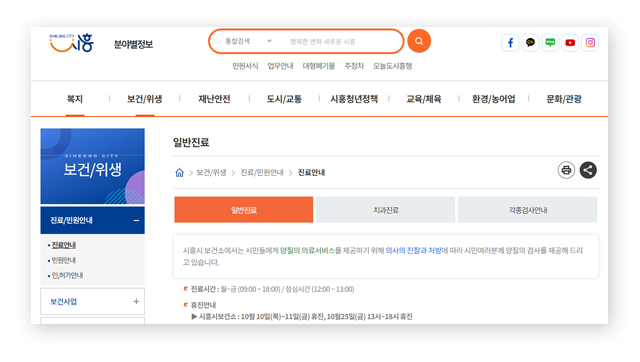 시흥시보건소의 다양한 정보와 서비스를 온라인에서 확인할 수 있습니다. 예방접종, 건강검진, 각종 보건사업 등에 대한 자세한 내용을 확인하고 신청할 수 있습니다.